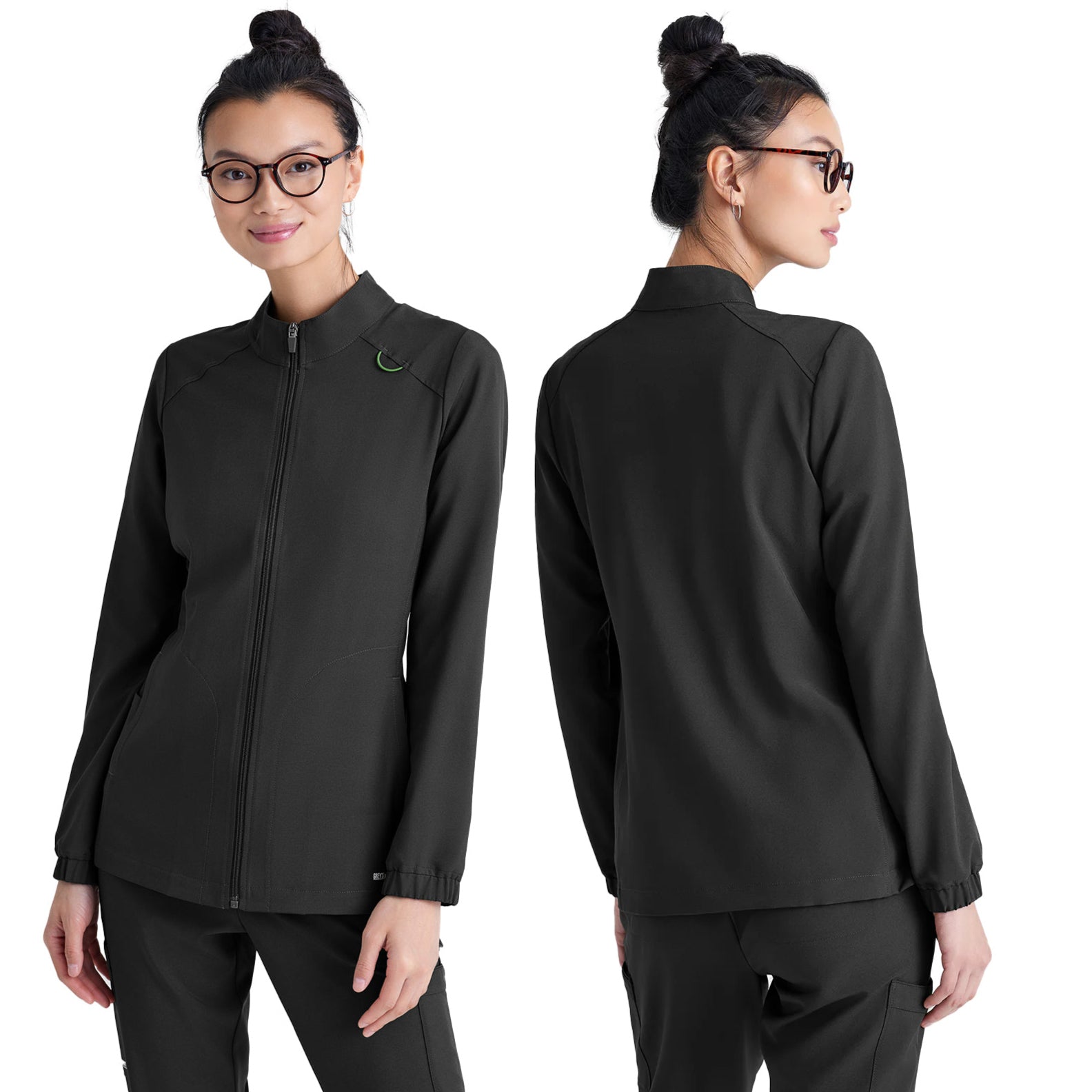 Complete your favorite Grey's Anatomy by Barco Evolve scrub set with this modern warmup. The athleisure-inspired jacket features two spacious pockets and a signature green badge loop to keep important items close by. Made with sustainable fabric, this soft, stretchy jacket wicks away moisture to keep you comfortable all day.